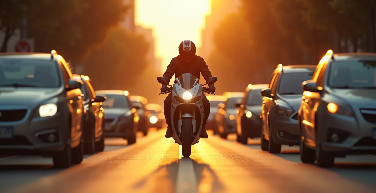 Hacerlo bien significa ser un fantasma respetuoso. La velocidad es tu principal aliada o enemiga: nunca superes los 20-30 km/h al filtrar. Vas más rápido que ellos, sí, pero lo suficientemente lento para frenar si un impaciente abre una puerta o cambia de carril sin mirar. Tu objetivo es fluir, no competir. El claxon, guárdatelo para emergencias de verdad. Unas ráfagas de luz son más sutiles y menos agresivas para advertir de tu presencia. Y por lo que más quieras, si un conductor se aparta un poco para dejarte pasar, levanta la mano o haz un gesto con la cabeza. Cuesta cero y convierte a un potencial enemigo en un cómplice.